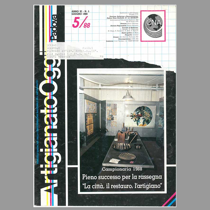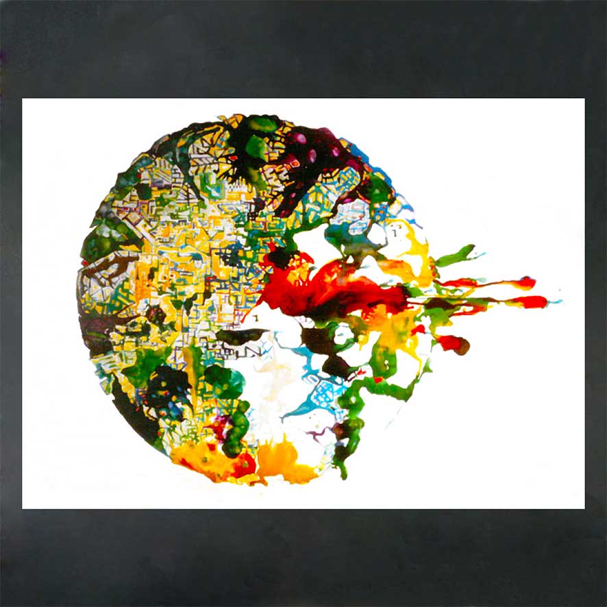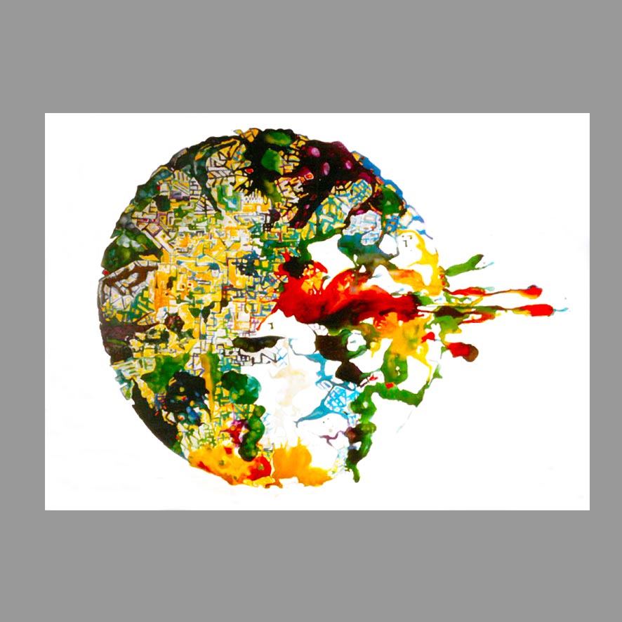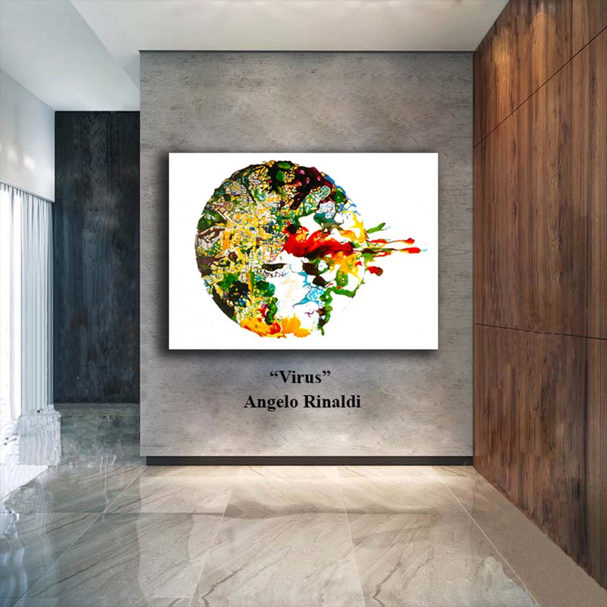 - Angelo Rinaldi, "Esplosione - Virus", vernici su perpex, h.cm.250x350, anno 1987, pubblicato, esposto in evento culturle nel 1988