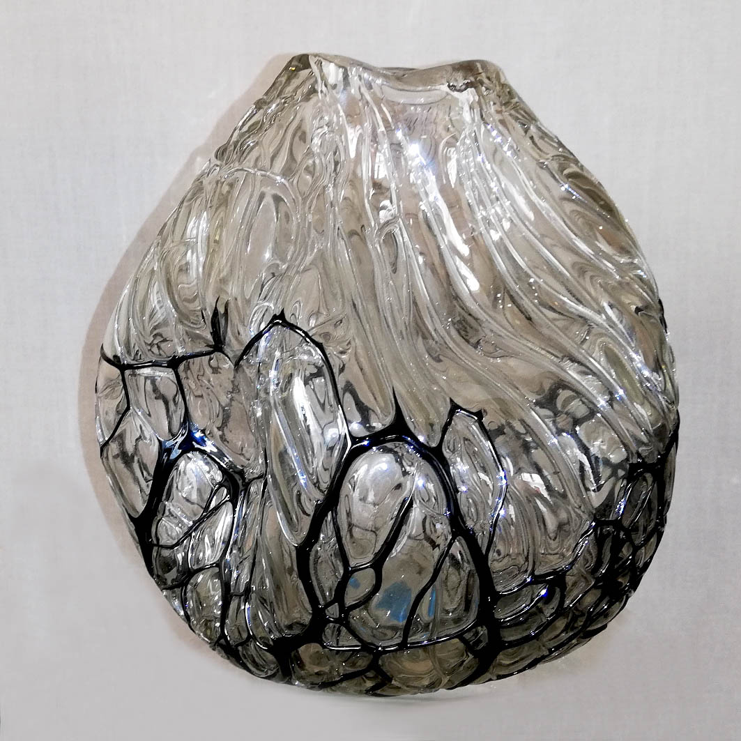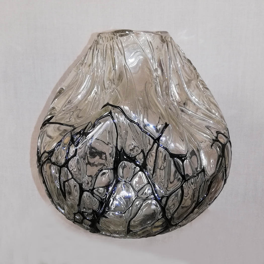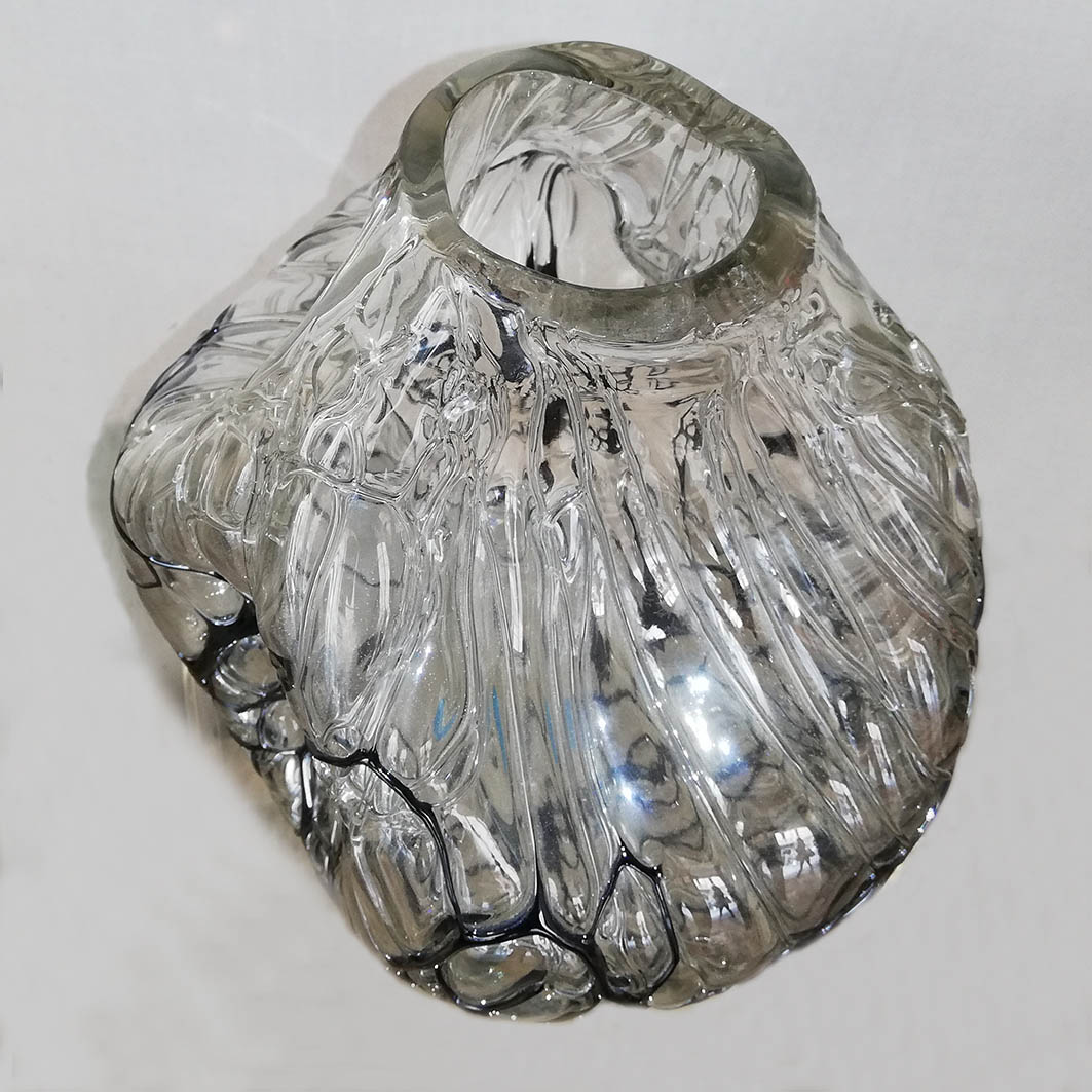 - Angelo Rinaldi, Liane, Vaso Scultura in vetro soffiato irregolare, pasta nera a filamenti irregolari intrecciati su tutta la superficie iridata, h.cm. 20 x2, firmata, 1964