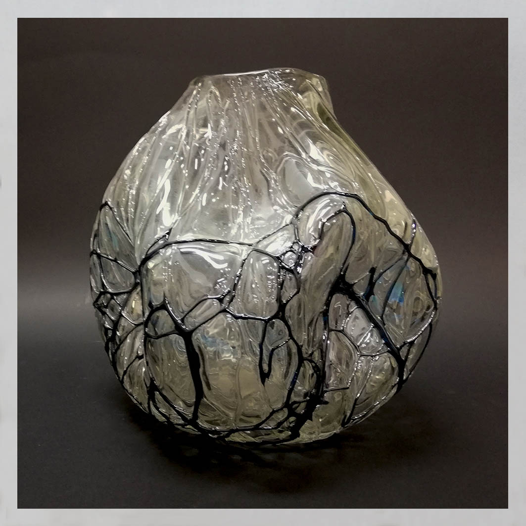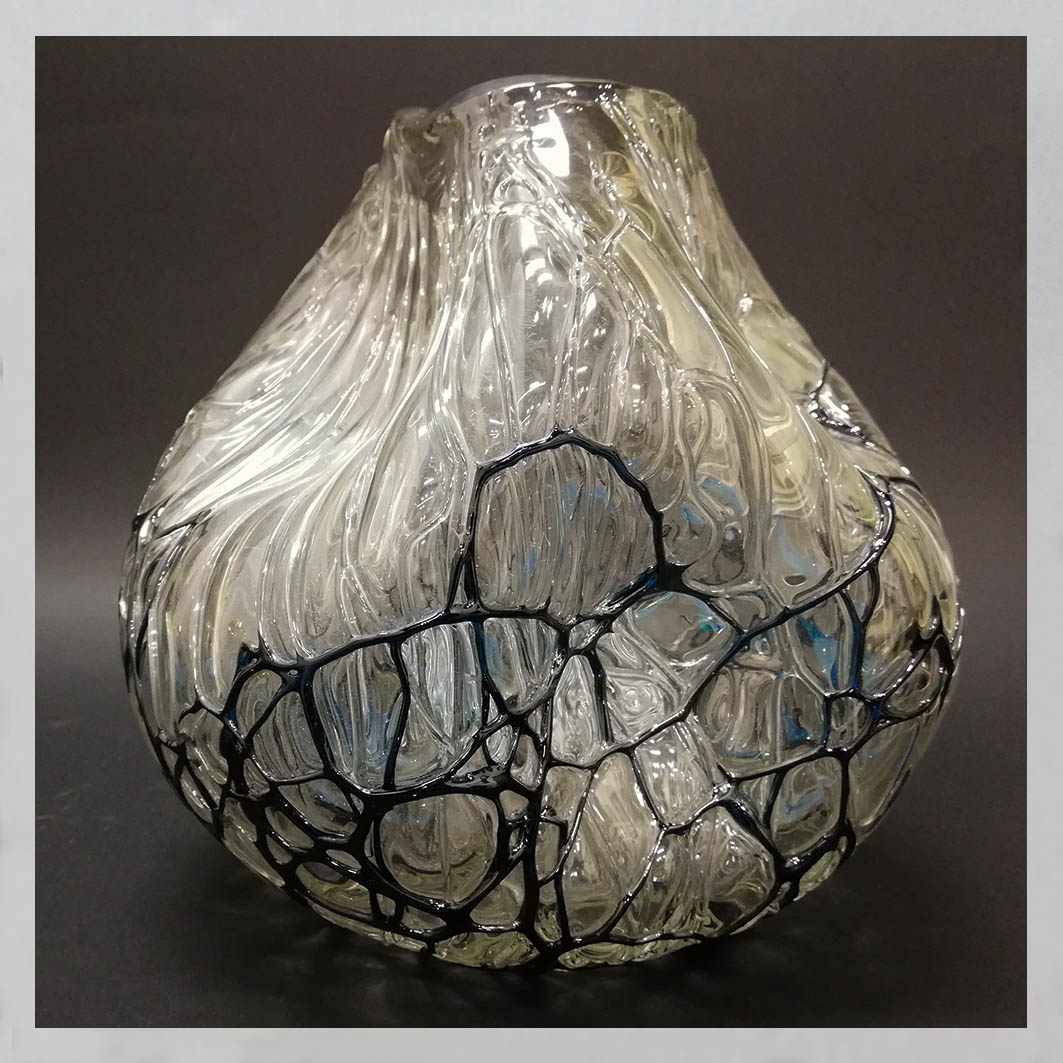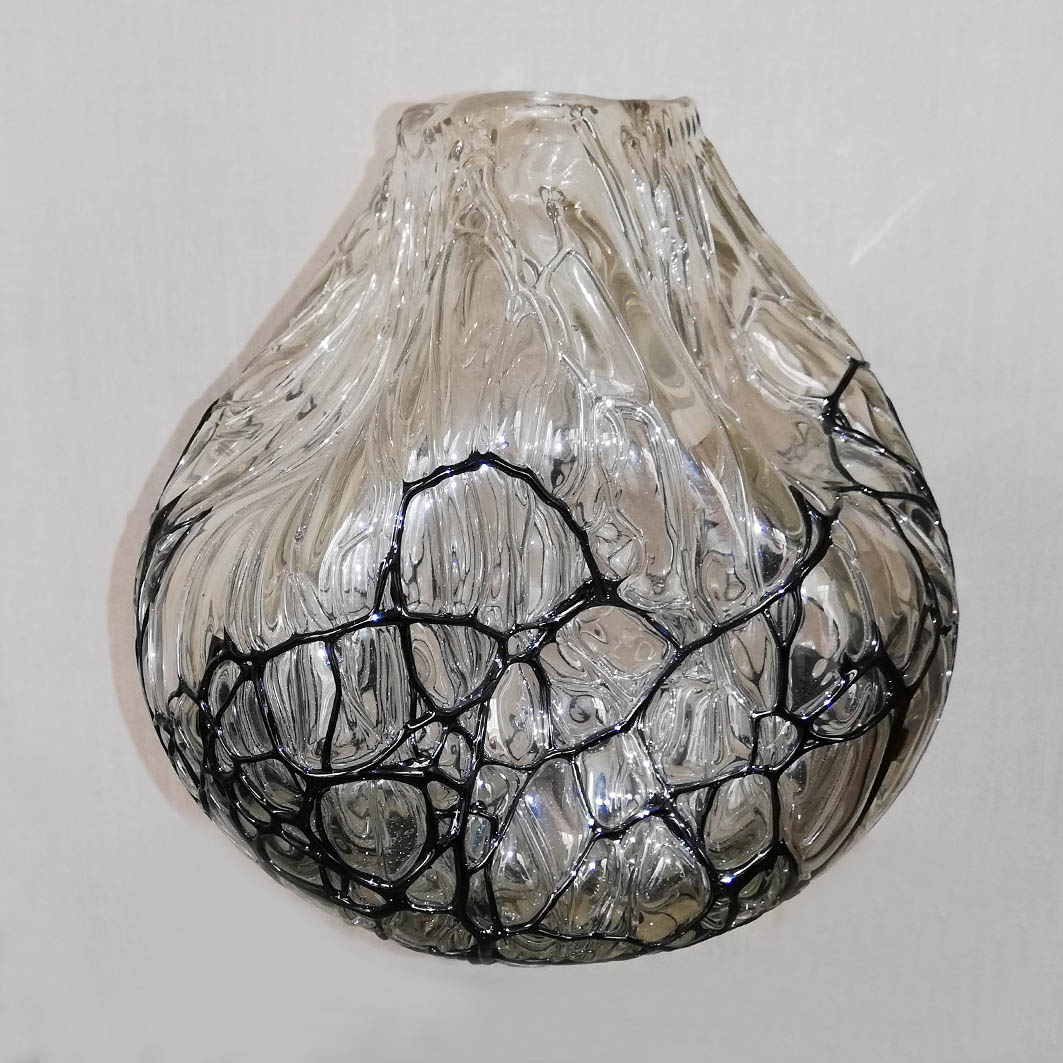 - Angelo Rinaldi, Liane, Vaso Scultura in vetro soffiato irregolare, pasta nera a filamenti irregolari intrecciati su tutta la superficie iridata, h.cm. 20 x2, firmata, 1964