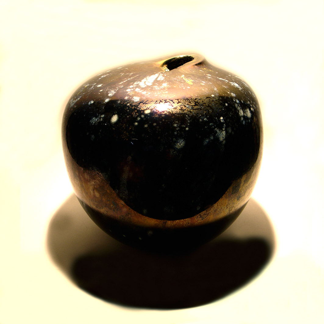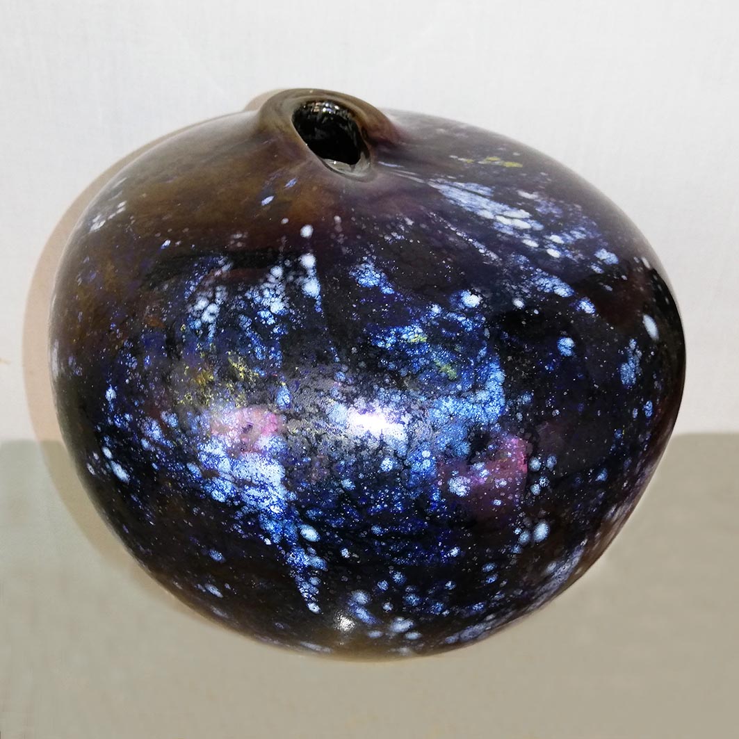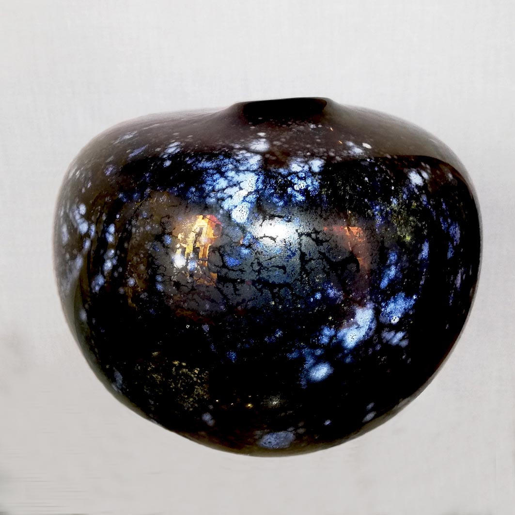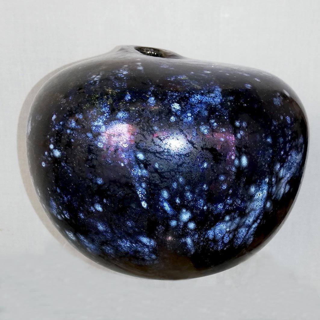 - Angelo Rinaldi, Siria, Vaso scultura a forma sferica irregolare in vetro soffiato su colore neroframmenti in lattimo sparsi su tutua la superficie con successiva iridazione, h.cm.20 x24, firma incisa, 1999